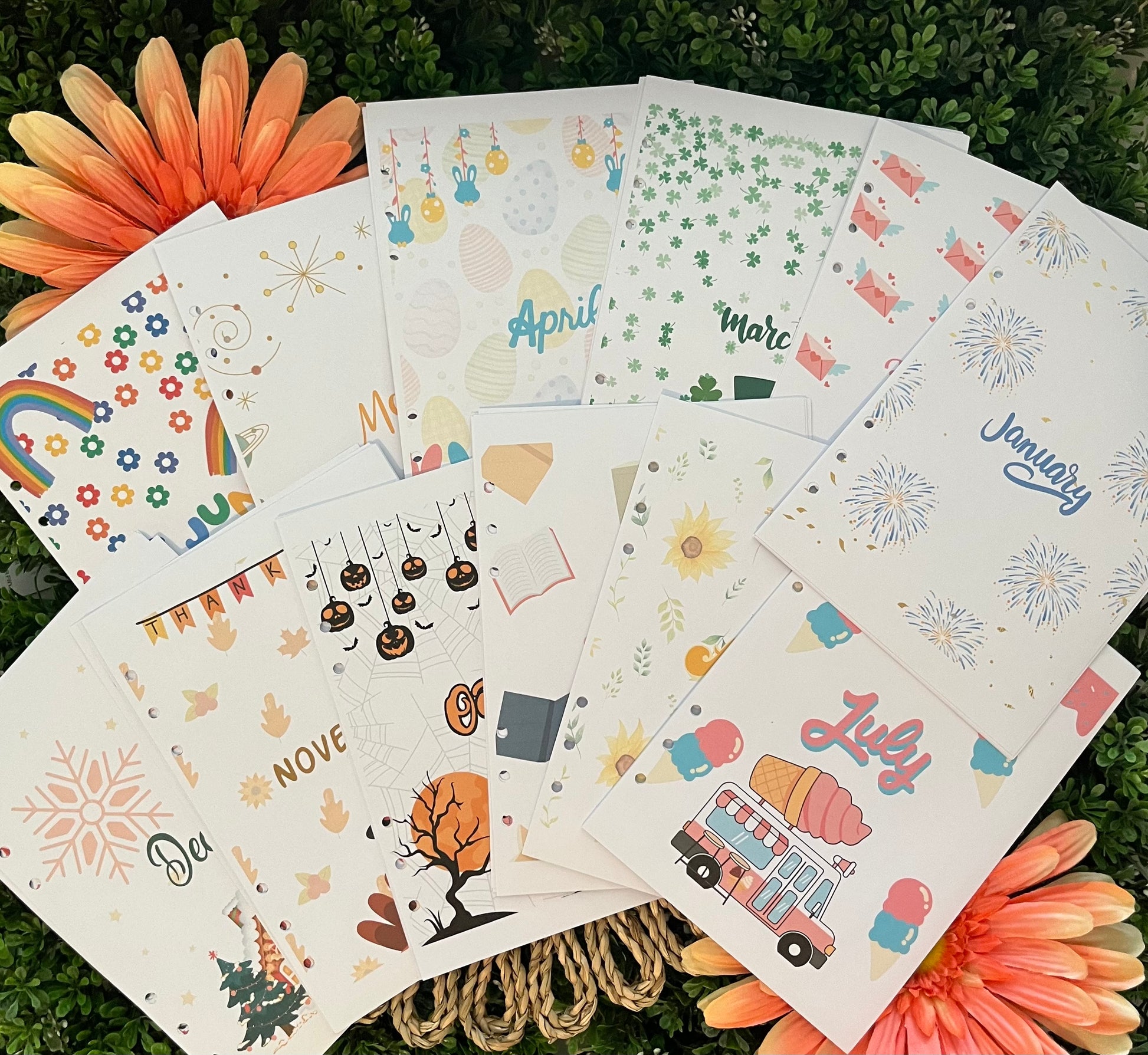 All pages are hole punched to fit inside of a 6 ring binder available on my website.